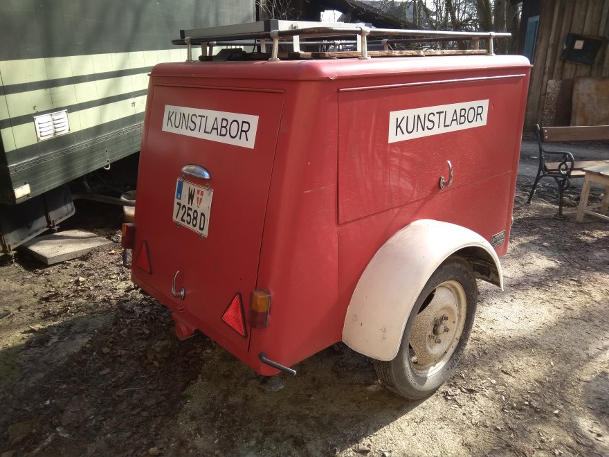 Ein alter Feuerwehr-Anhänger dient als mobiles Kunstlabor, welches stetig transformiert wird. Für STWST48x3 wird es zum wild_chive_lab, ein Hunger- und Kunst-Hybrid mit kaltem Ayran und Wurzelrauschen.